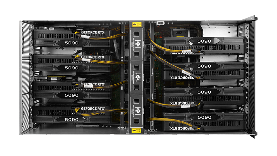 GPU Card | Passthrough 8-GPU Server (Fan Version): Supports 8× 600W 3-width, 3.3-width, 3.5-width, or 4.5-width RTX 5090 fan GPUs or other 600W fan GPUs. Features a 4+4 front-rear separated upper and lower airflow layout. Passthrough 8-GPU Server (Blower Version): Supports 8× 600W 2-width or 2.5- width RTX 5090 blower GPUs or other 600W blower GPUs. Features an 8-GPU rear-aligned centralized airflow cooling layout. |